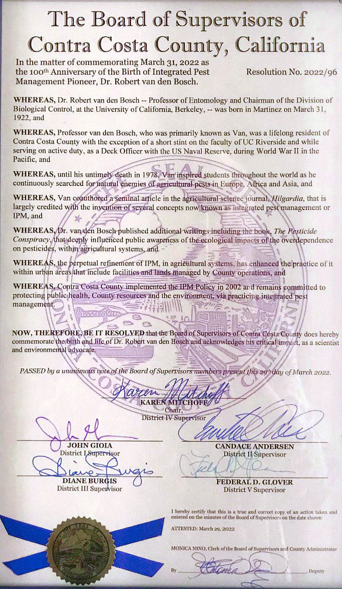 While reading it more thoroughly, Wade noticed that Van’s birthday was March 31, 1922 and that this year would mark the 100-year anniversary of his birth. Wade then went into action, checking with his manager about the possibility of sending a resolution to our County Board of Supervisors. The purpose of this resolution would be to commemorate Professor van den Bosch’s birth and to celebrate the values of responsible pest management in our County and in our State.